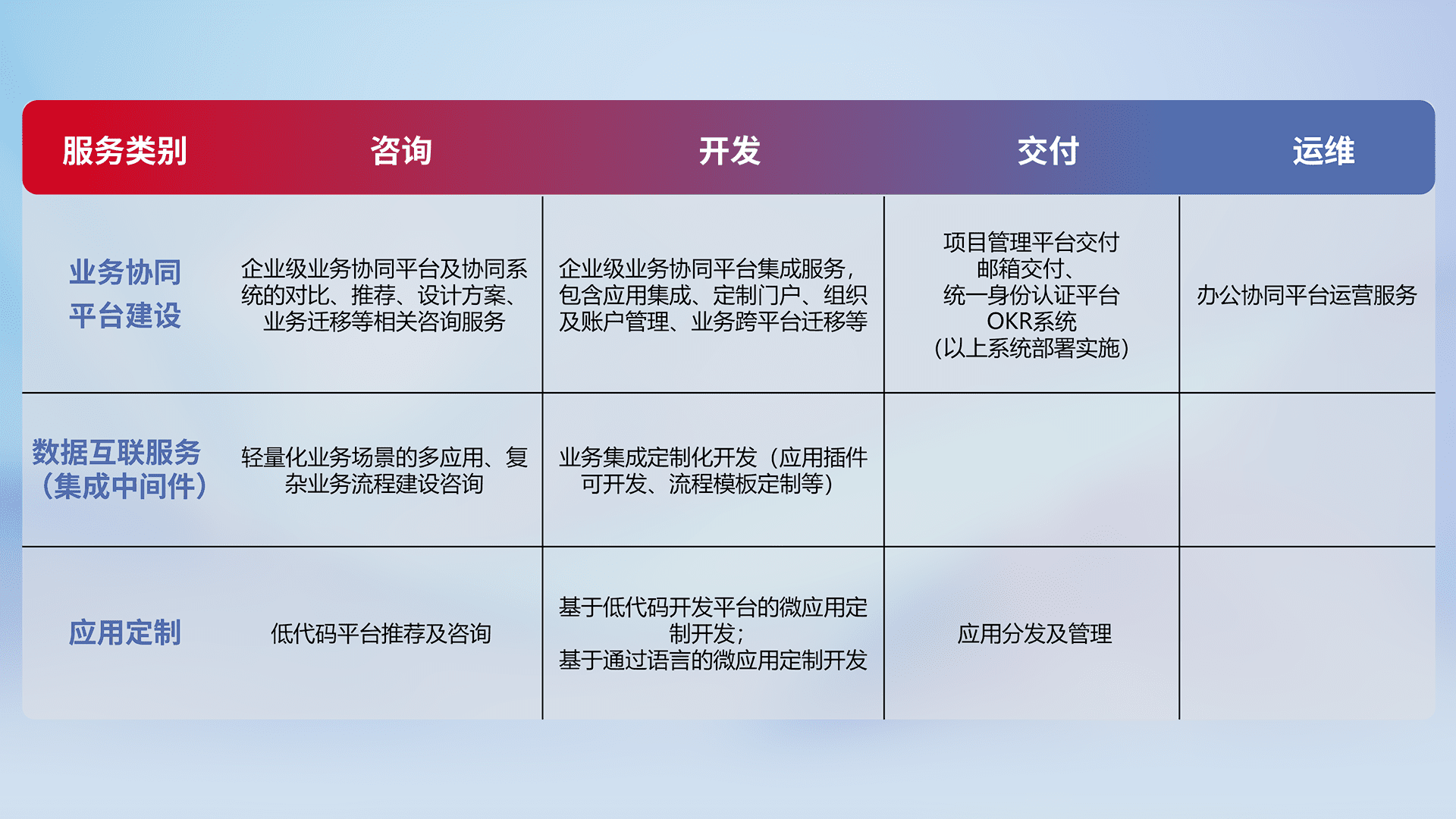 针对钉钉、、企微、、IDaas等平台级产品提供产品的规划、、、方案、、、、交付、、定制化开发等服务,,,实现如统一协同办公、、、、智能客户服务、、、混合会议管理、、、、智能数据查询、、、、等业务场景,,实现数字化转型。。